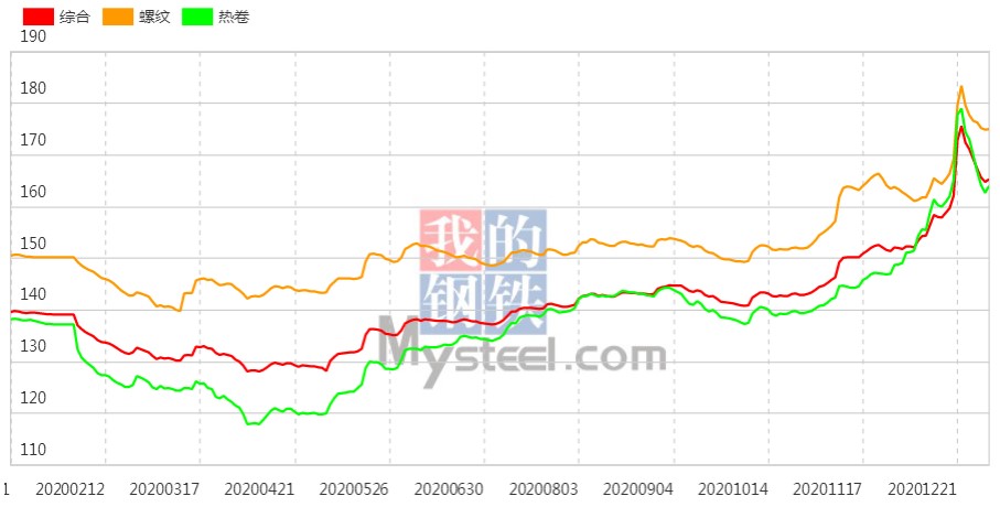12月31日,國內(nèi)鋼材指數(shù)(Myspic)綜合指數(shù)報165.34(絕對價格指數(shù)4709),較上一交易日上漲0.35%。其中,螺紋鋼指數(shù)報175.64(絕對價格指數(shù)4424),較上一交易日上漲0.07%。熱卷指數(shù)報164.03(絕對價格指數(shù)4599),較上一交易日上漲0.80%。