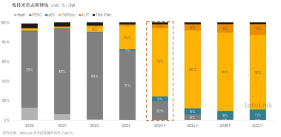 從“n型”技術(shù)路線市占率來(lái)看,2024年TOPCon已拿下70%左右的市場(chǎng)份額,按照InfoLink Consulting預(yù)測(cè),到2025年TOPCon市占率將提升至80%。